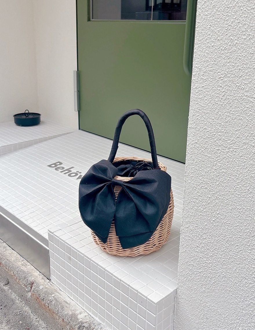 A summer bag combining woven willow with a large, sculpted ribbon. It brings a playful touch to simple, everyday outfits.